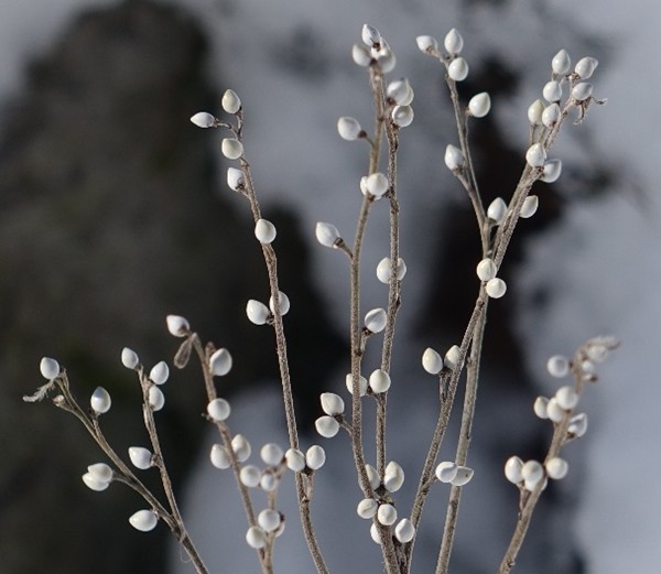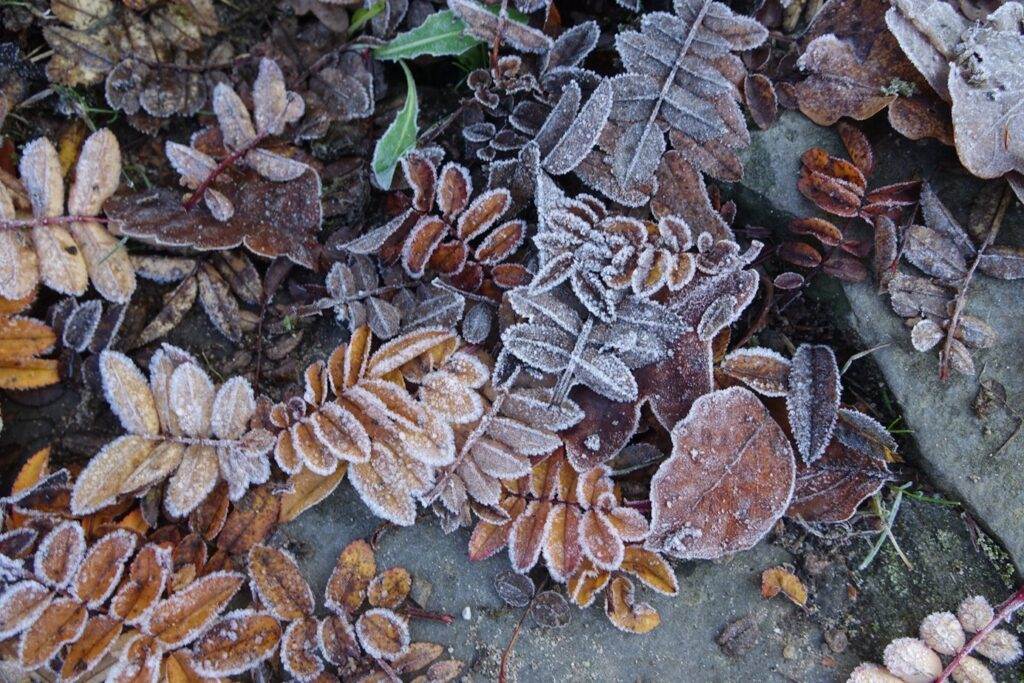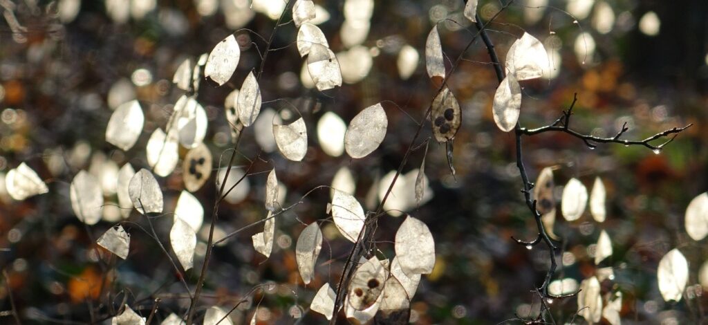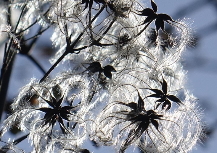 Verder valt er veel te genieten van andere vruchten en zaden en van de overgebleven staketsels van de kruiden die prachtig kunnen oplichten als de laagstaande zon ze laat oplichten, zoals Wilde judaspenning, Kleverige salie en Look-zonder-look. Nu begrijp je waarom Glad parelzaad (Lithospermum officinale) zo heet, want de wit glimmende nootjes waarin het zaad zit, lijken op parels. Ze zijn ook nog eens keihard. Lithospermum komt van het Griekse lithos (steen) en sperma, vanwege de harde deelvruchtjes, die men als zaden beschouwde. De dagen met nachtvorst zijn talrijk en als je er vroeg bij bent kun je prachtig versierde vormen zien van bladeren, vruchten en soms zelfs bloemen, alsof ze gesuikerd en gekonfijt zijn. De bijna zilveren zaadpluimen van de Wilde bosrank zijn in Engeland bekend als “Old Man’s Beard”, terwijl de plant zelf bekend staat onder de prachtige naam “Traveller’s joy.