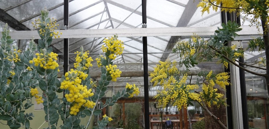 Terwijl in het noordelijk halfrond spoedig de winter begint, breekt het voorjaar uit in het zuidelijk halfrond. In de kas kun je enkele Australische bloeiers bewonderen, waaronder diverse acacia’s. De bij ons van oudsher bekende en geliefde mimosa bloeit wat later, maar is van hetzelfde geslacht: Acacia dealbata. In Portugal is het een invasieve exoot die de inheemse Zwarte els verdringt. De heerlijk geurende boeketten worden in ons land verkocht als voorjaarsbodes, geïmporteerd uit Zuid-Europa. De zachte winters van tegenwoordig maken het mogelijk dat je ze nu ook kunt zien in ons land. Bij strenge vorst kunnen ze echter het loodje leggen.