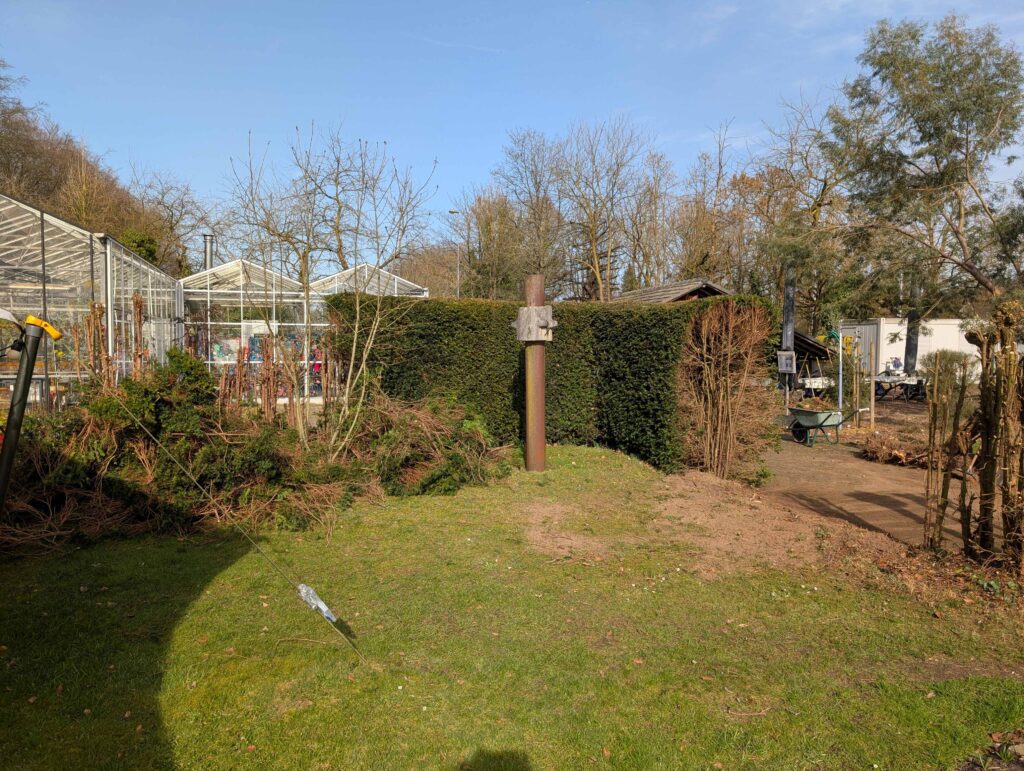 Aan de andere kant van het hoofdpad komt een klein nieuw taxushaagje. Dit schermt de vrijwilligersplek subtiel af en vormt tegelijk een visuele spiegeling van de grote haag. Daarmee krijgt de hele kop van de Tuin van de Toekomst een rustiger en evenwichtiger uitstraling.