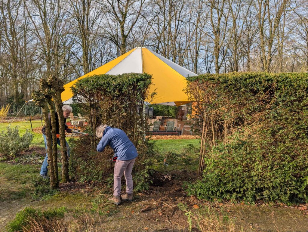 De vrijwilligers zijn nu bezig de twee ‘armen’ van de haag in te korten en te verlagen. Zo ontstaat een vriendelijker overgang tussen terras en tuin, en blijft de haag toch zijn herkenbare vorm behouden.