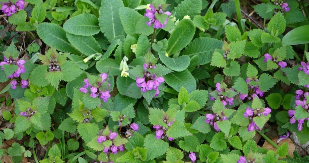 De eerste is Gevlekte dovenetel die in de Hortus aan de rand (zoom) van het “Iepenbos” gedijt. Het is een soort die kenmerkend is voor voedselrijke zomen van relatief schaduwrijke mantels en zomen. De botanische tuin herbergt met Gevlekte dovenetel een groep van nog ruim twintig soorten die een voorkeur voor dergelijke condities hebben. Om er enkele te noemen: Hondsdraf, Look-zonder-Look, Dolle kervel, Dagkoekoeksbloem, Witte dovenetel, Geel navelkruid, Akkerkool, Groot glaskruid, Overblijvende ossentong, etc. Daartoe behoren ook soorten die een beetje in toom worden gehouden, zoals het door tuiniers gevreesde Zevenblad en andere weinig gewaardeerde soorten als Grote brandnetel en Kleefkruid. Overigens, veel van die soorten worden wèl gewaardeerd door een groot aantal insecten. Dagpauwoog, Gehakkelde aurelia, Atalantaen Kleine vos kunnen niet leven zonder de Grote brandnetel. Hun rupsen voeden zich uitsluitend met deze plant. Daarom worden niet alle brandnetels in de tuin gewied. In de komende maanden zullen meerdere voorbeelden van bestuivers in de nieuwsbrief aan de orde komen.
