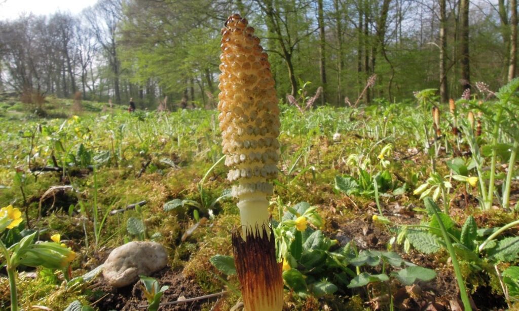 De derde is de Reuzenpaardenstaart. In het vroege voorjaar verschijnen de bleke fertiele scheuten met bovenop een sporenaar. Ze lijken eerder op paddenstoelen dan planten. De lange sporenaren bestaan uit schubjes waaronder de sporen zitten. Ze verdwijnen weer als de sporen rijp en verspreid zijn. Daarna groeien pas de hoge manshoge vegetatieve stengels. Reuzenpaardenstaart komt uit dezelfde familie als Heermoes. Deze laatste is de schrik van de tuiniers want bijna niet uit te roeien. Terwijl Heermoes in ons land tot de meest algemene soorten behoort, is Reuzenpaardenstaart veel zeldzamer. Dat komt omdat zijn natuurlijke standplaatsen in ons land zeldzaam zijn, zoals bronbossen, slootkanten en nat grasland waar schoon kalkrijk water uit de bodem omhoog komt. Dankzij diepe beworteling kan hij met zijn uitlopers ook drogere of verstoorde plekken veroveren. In de Hortus heeft hij zich daarom de laatste jaren sterk uitgebreid. Grote paardenstaart behoort tot de vaatplanten: ze hebben wortels, een stam en bladeren.