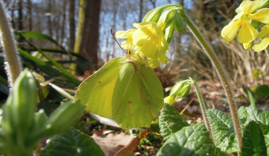 Uit het ruime aanbod prachtige bloeiers deze maand, kunnen hier vanwege ruimtegebrek slechts enkele soorten getoond worden. Laten we beginnen met sleutelbloemen om als het ware de lente te openen. De naam ‘sleutelbloem’ stamt waarschijnlijk uit de legende waarin Petrus zijn gouden sleutels van de hemelpoort liet vallen. Op de plaats waar ze de grond raakten, zou een plant zijn gaan groeien met trosjes goudgele bloemen, die doen denken aan een sleutelbos. Pasen valt ook nog eens in de bloeiperiode van sleutelbloemen. Zo werden ze het symbool voor het begin van de lente en het ontsluiten van de hemel. Een oude naam is ook hemelsleutel. Die naam is in ons land tegenwoordig gereserveerd voor een vetplant die ook in de tuin te vinden is, maar veel later in het seizoen tot bloei komt. Twee soorten bloeien al in maart: Slanke sleutelbloem en Stengelloze sleutelbloem. De derde is de Gulden sleutelbloem die meestal iets later begint te bloeien. Deze drie groeien van nature zelden zo dicht bij elkaar als in de Hortus en dan is er kans op hybridisatie. Sleutelbloemen worden graag bezocht door insecten. De nectar van de sleutelbloem ligt diep in de bloembuis. Daar kunnen alleen bestuivers met een lange roltong bij, zoals hommels en vlinders. Bijgaand een foto van de Citroenvlinder die zijn roltong diep in de bloembuis steekt. Charles Darwin was al geïnteresseerd in sleutelbloemen en hun interactie met insecten. Hij ontdekte dat er twee typen bloemen van sleutelbloemen zijn waardoor kruisbestuiving makkelijker ontstaat zodat de nakomelingen beter aangepast zijn (meer ‘fit’ = aangepast) dan bij zelfbestuiving. De beroemde term “Survival of the fittest” voor deze natuurlijke selectie binnen een populatie is later bedacht door Herbert Spencer. Het is ingewikkelde maar interessante materie. In “Vroege Vogels” wordt één en ander duidelijk uitgelegd aan de hand van de Gulden sleutelbloem. link: https://www.youtube.com/watch?v=DzpWvZpgxdY