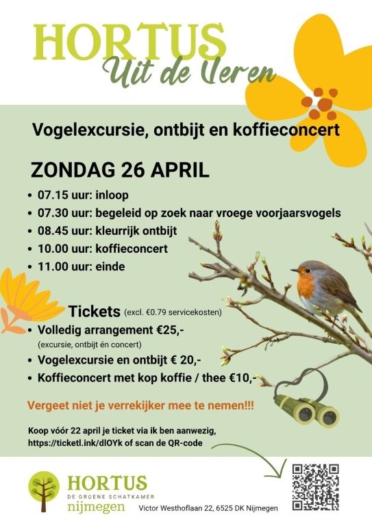 Nog voordat de stad ontwaakt, klinkt in de Hortus Nijmegen een levendig ochtendkoor. Tjiftjafs, koolmezen, putters, appelvinken, spechten en boomklevers laten zich horen en met een beetje geluk zie je zelfs een overvliegende roofvogel. Op zondag 26 april beleef je dit tijdens Uit de Veren, een bijzondere ochtend met excursie, ontbijt en muziek.
