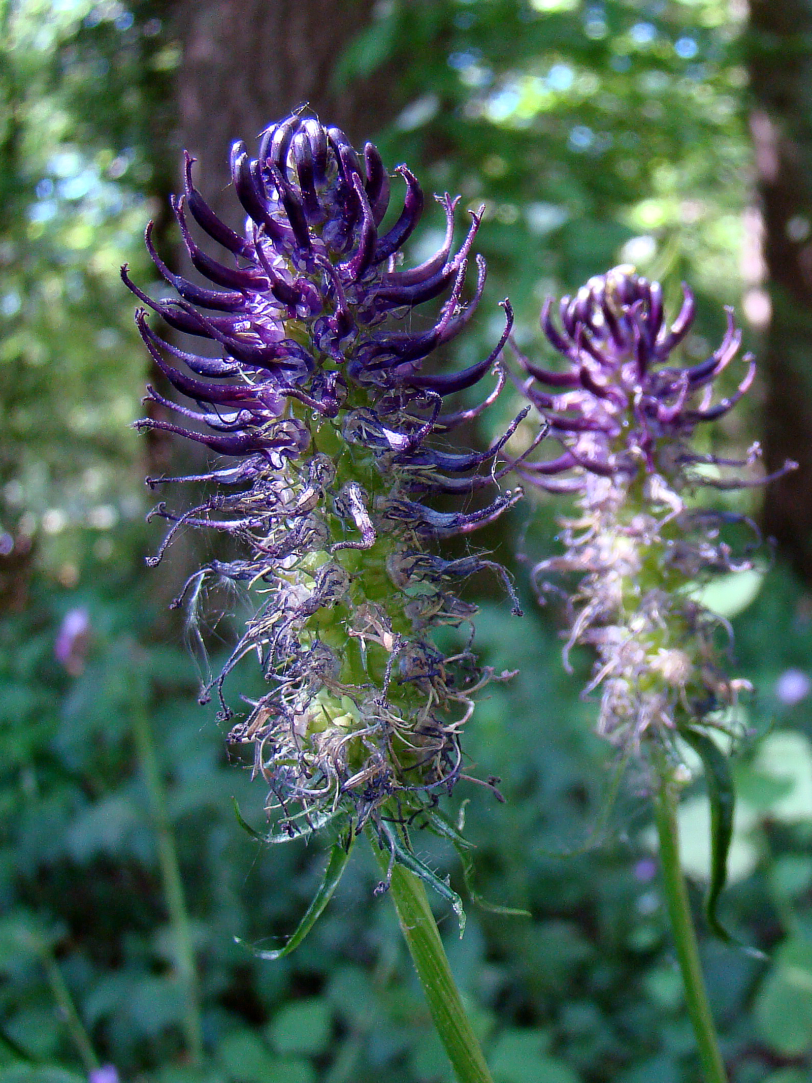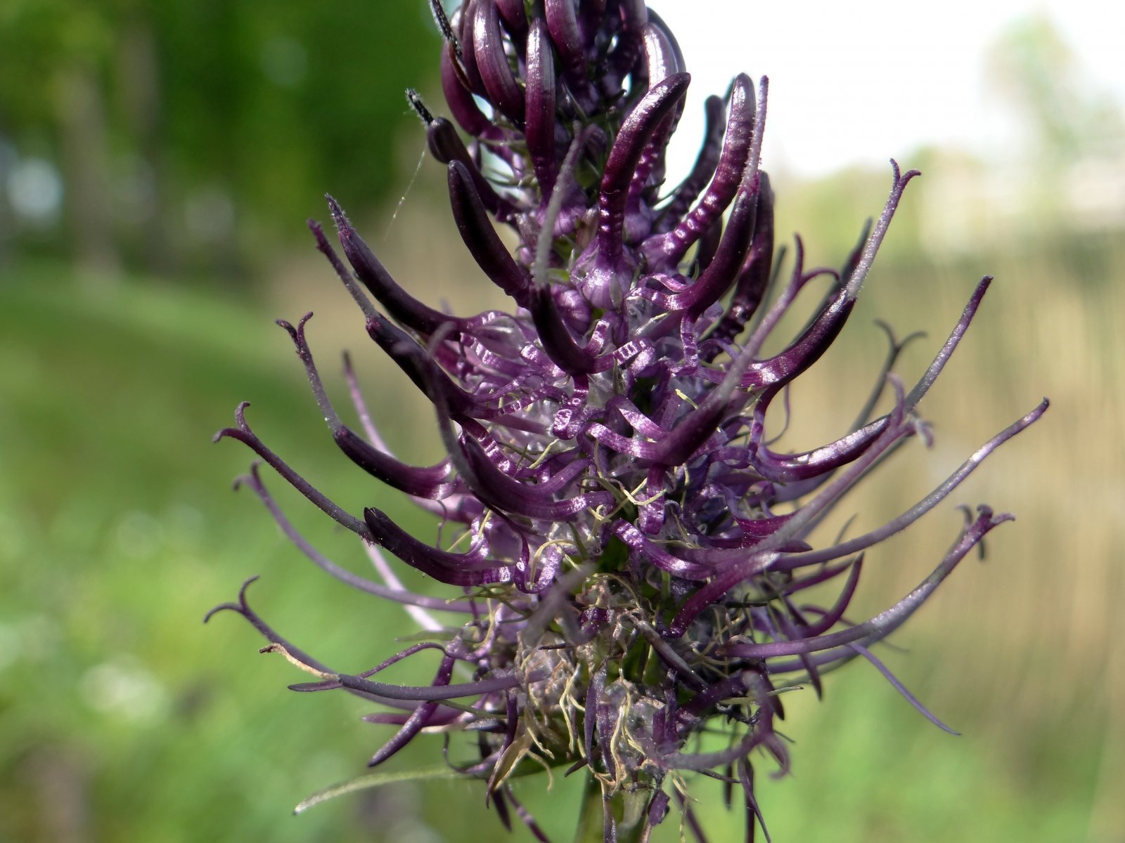 Op een paar plekken in en rond Nijmegen is deze rode-lijst-plant te vinden. Hortus Nijmegen prijst zich gelukkig met een mooi ‘veldje’. Dieppaars en moeilijk scherp en op kleur op de foto te krijgen merk ik. Het is familie van de klokjes, dat had ik niet gedacht. Toch bij beter kijken, vooral op een vergrote foto, zijn de afzonderlijke bloemetjes een soort open klokjes met 5 naden (bloembladen) die aan de bovenkant in een smal topje vastzittend eindigen. En daaruit steekt dan de stijl met 2 stempels, heel dunnig en sierlijk. Tenminste na een tijdje, want de tweeslachtige bloem (zowel mannelijke als vrouwelijke kenmerken in één bloem) bloeit eerst mannelijk en daarna vrouwelijk.